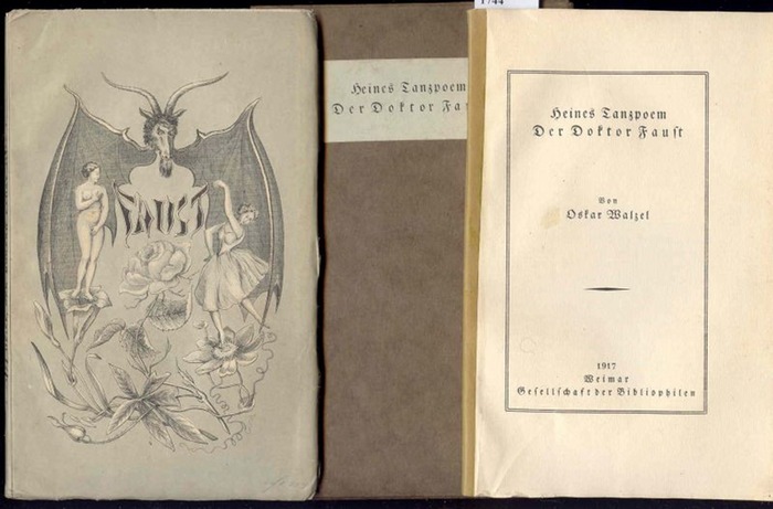 Der Doktor Faust. Ein Tanzpoem, nebst kuriosen Berichten über Teufel, Hexen und Dichtkunst. Hamburg, Hoffmann und Campe, 1851. 8vo. 103 S. Unbeschnittene OBrosch. m. illustr. Umschlägen. Zusammen mit Begleitschrift in OPp.-Kassette m. Deckelschild. WG² 22. - Erste Ausgabe, zweiter Druck. - Begleitschrift: Oskar Walzel: Heines Tanzpoem. Der Doktor Faust. Weimar, Gesellschaft der Bibliophilen, 1917. 47 S. - Ränder gering angestaubt u. minimal fleckig, schönes Ex.