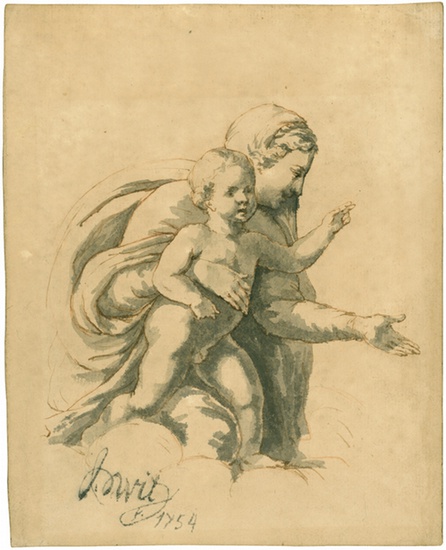 Mutter Maria mit dem Jesusknaben im Arm über Wolken. _. Pinsel in Grau, über roter Kreide, auf Bütten, unten signiert und datiert ?J. Wit f. 1754?. 17,7:14,4 cm. - Papier etwas vergilbt. Sehr reizvolle Zeichnung, die im Todesjahr des Künstlers entstanden ist. Nach einem Studium in Antwerpen und paralleler intensiver Beschäftigung mit Werken von P.P. Rubens (1577-1640) kehrte Jacob de Wit in seine Heimatstadt zurück. Hier bekam er bald Aufträge für Wand- und Deckendekorationen von Privathäusern und Kirchen, die ihn rasch zu großem Ansehen verhalfen.