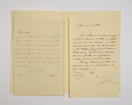 2 (dav. ein eigenh.) Briefe m. eigenh. Unterschrift. Wien bzw. ohne Ort, 12. V. 1854 bzw. 6. VI. 1858. Zus. 2 S., 8°. Zedlitz, der u.a. 1809 an den Schlachten von Regensburg, Aspern und Deutsch Wagram teilgenommen hatte, quittierte auf Wunsch seiner Familie seine militärische Laufbahn und ging zur Bewirtschaftung der eigenen Güter nach Ungarn. 1810 kehrte er als Kammerherr nach Wien zurück und verkehrte dort in literarischen Zirkeln. Als 1836 seine Ehefrau verstarb, kehrte Zedlitz wieder in den Staatsdienst zurück. Bis zur Märzrevolution 1848 wirkte Zedlitz in Wien meistens im Kriegsministerium und im diplomatischen Korps und reiste u.a. 1840 u. 1842 zusammen mit Metternich nach Köln. Neben den Dienstgeschäften machte er die Bekanntschaft von August Daniel von Binzer. In dessen Haus erlebte Zedlitz wichtige literarische Inspirationen bei Diskussionen u.a. mit Ferdinand Freiligrath, Carl Leberecht Immermann, Gottfried Kinkel und Karl Simrock. Nach der Revolution blieb Zedlitz bis 1851 auf seinen Besitzungen in Aussee (Salzkammergut), wo er sehr zurückgezogen lebte. - Der Empfänger der auf Französisch abgefassten Briefe ist Jacques (Jacob) Mislin (1807-1878). Der aus ärmlichen Verhältnissen stammende Mislin konnte dank seines Onkels an der berühmten Lehranstalt von Porrentruy im Schweizer Kanton Bern studieren, wo er nicht viel später auch selbst unterrichten sollte. Der 1830 zum Priester geweihte kath. Theologe wurde 1836 auf Vermittlung des Grafen von Bombelle an den Wiener Hof berufen, wo er einer der Lehrer der Söhne von Erzherzog Franz Karl und Erzherzogin Sophie wurde und damit sowohl den zukünftigen Kaiser Franz Joseph wie auch Erzherzog Ferdinand Maximilian (später Kaiser Max von Mexiko) unterrichtete (u.a. auch in Erdkunde). Vor der Revolution von 1848 unternahm Mislin eine Pilgerreise von Wien über Budapest und Konstantinopel nach Jersusalem. Der danach erschienene Reisebericht wurde in mehrere Sprachen übersetzt und mehrfach nachgedruckt. In den folgenden Jahren leitete er die Bibliothek am Hof der Herzogin von Parma, Erzherzogin Marie Louise, wurde zum Abt von St. Maria von Deg (Ungarn), geheimer Kämmerer u. Hausprälat Papst Pius' XI., Apostolischer Pronotar, Kanoniker der Kathedrale von Großwardein, Träger zahlr. Orden (u.a. von Spanien, Parma u. des Ritterordens vom Heiligen Grab zu Jerusalem) sowie Mitglied zahlr. Akademien. Der Verfasser zahlr. Publikationen und Vertraute des belgischen Königs und des Grafen von Chambord blieb nach der Rückkehr von seiner Pilgerreise in Wien, wo er weiterhin in persönlichem Kontakt mit dem Kaiserhaus stand. - In einem numerierten, von Mislin eigenh. beschrifteten Papierumschlag.