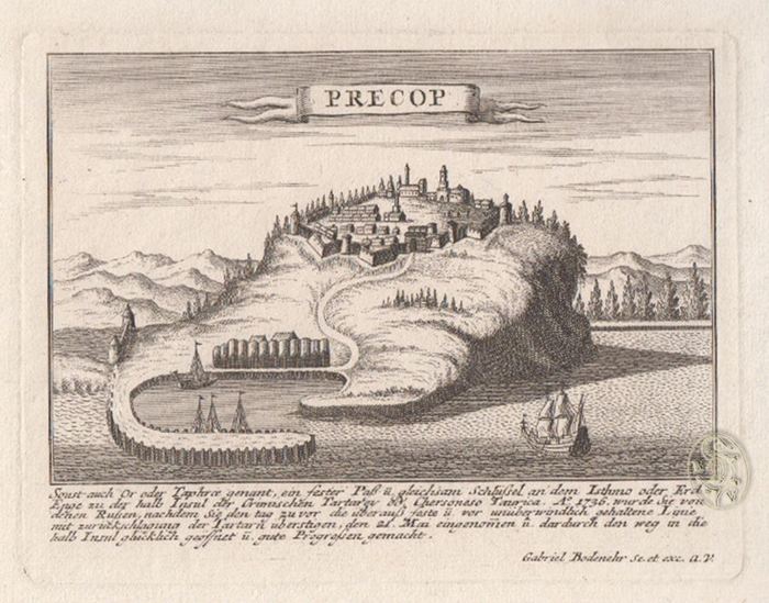 Precop. Sonst auch Or oder Taphrae genant, ein fester Paß u. gleichsam Schlüßel an dem Isthmo oder Erdenge zu der halb Insel der Crimmschen Tartaren od. Chersonaeso Taurica. Ao. 1736 wurde Sie von denen Rußen, nachdem Sie den tag zuvor die überauß feste u. vor unüberwindlich gehaltene Linie mit zurückschlagung der Tartarn überstigen, den 21. Mai eingenommen u. dadurch den weg an die halb Insel glücklich geöffnet u. gute Progreßen gemacht. Augsburg [ca. 1740]. Orig.-Kupferstich. 20 x 32 cm. (Blattgr.); 13 x 17 cm. (Bildgr.). In sehr gutem Zustand. Selten! Aus: "Geographische Vorstellung der so genandten Kleinen Tartarey". Die Stadt heißt heute Perekop. Die strategisch wichtige Landenge trennt das Schwarze Meer vom Asowschen Meer. Im 5. Russischen Türkenkrieg erstürmte 1737 die russische Hauptarmee unter dem Oberbefehlshaber Feldmarschall Burkhard Christoph von Münnich die an der Landenge errichteten Verteidigungslinien der Krimtataren. Seit 1783 gehörte die Landenge zu Russland.
