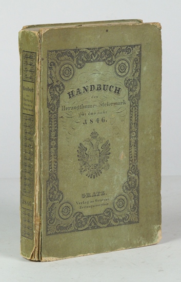 Handbuch des Herzogthumes Steiermark für das Jahr 1846. Graz, Andreas Leykam Erben (Einband: Verlag im Gratzer Zeitungscomptoir), (1845). 8°. 6 Bll., 482 S., Bedruckter illustr. OPpbd. Detailliertes Adressverzeichnis für die Steiermark mit einem umfangreichen ?Nahmen-Verzeichniss?. Die S. 379-444 enthalten ein ?Verzeichniss der Häuser und ihrer Besitzer in der k. k. Hauptstadt Gratz?. - Einband beschabt, bestoßen u. fleckig. Rückenkanten eingerissen. Innendeckel u. Titel gestempelt. Gebräunt u. stockfleckig.