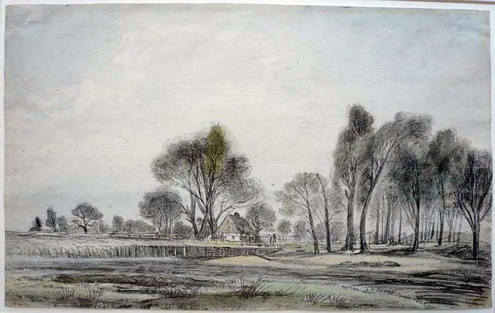 Landschaftsstudie mit kleinem Gehöft. Schwarze Kreide und Tuschpinsel, aquarelliert. Um 1800. Auf Bütten mit Wasserzeichen. 19,5 x 31,6 cm. Blattfüllende, bildhafte Landschaftsstudie einer weiten flachen Landschaft. Die schlanken, hoch aufragenden Bäume bilden einen interessanten Kontrast zu der - mit niedrigem Horizont und hohem Himmel - auf Weite angelegten Komposition. Zart aquarellierte, vermutlich in einer nordischen oder niederländischen Gegend entstandene Studie. - In den oberen Ecken montierungsbedingt etwas wellig.