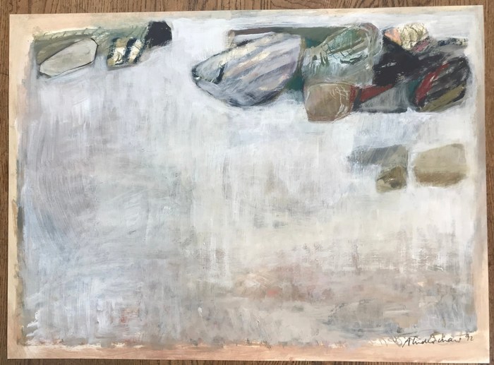 Vor der Burg I. Oel auf Papier. 1992. Blatt/Bildgrösse: 45,5x62 cm. Unten rechts signiert und datiert. Rückseitig bezeichnet.
