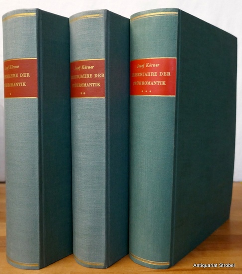 Krisenjahre der Frühromantik. Briefe aus dem Schlegelkreis. Herausgegeben von Josef Körner. 3 Bände. Bern und München, Francke, (1969 und 1958). XXIV S., 2 Bl., 667 S., 1; 4 Bl., 548 S., 2 Bl.; 725 S. Mit 24 Tafeln. Gr.-8° (24,5 x 17,5 cm). Original-Leinwand. Die beiden Textbände in 2., unveränderter Auflage 1969 (zuerst 1936/37 erschienen), der umfangreiche Kommentarband konnte erst posthum 1958 erscheinen. Die 8 Tafeln mit Schriftproben beidseitig bedruckt. - Die Einbände teils gering verblaßt. Schönes Exemplar.