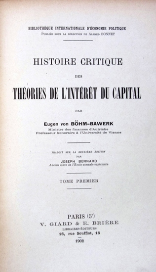 Histoire Critique des Théories de l'Intérêt du Capital. Traduit sur la deuxième Édition par Joseph Bernard. Paris, V. Giard & E. Brière Libraires-Éditeurs, 1902-1903. 8vo. XXIV, 450, 1 Bl., 299 S. Neuer Halblederband mit Rückenprägung. 2 Bde. (in 1). (Bibliothèque Internationale d'Économie Politique. Publiée sous la Direction de Alfred Bonnet). Französische Erstausgabe. - Vorlage der Übertragung bildete offenbar die zweite Originalausgabe, die von Böhm-Bawerk in den Jahren 1900 bis 1902 herausgebracht wurde, wofür insbesondere die erste Abteilung vom Autor erheblich vermehrt und verbessert worden war. Die Erstausgabe erschien in den Jahren 1884 bis 1889, eine Ausgabe letzter Hand in den Jahren 1909 bis 1914. Eine vierte, unveränderte Ausgabe des überaus bedeutenden Werks wurde im Jahre 1921 herausgebracht, mit einem Geleitwort von Friedrich von Wieser. Die vorliegende französische Ausgabe wurde offenbar von Alfred Bonnet deutlich gekürzt. - In der vorliegenden Arbeit übertrug Böhm-Bawerk (1851-1914) die Grundanschauungen der österreichischen Grenznutzenschule auf das Problem des Kapitalzinses und erklärt den Kapitalzins als Agio beim Tausch gegenwärtiger gegen zukünftige Güter (Agiotheorie).
